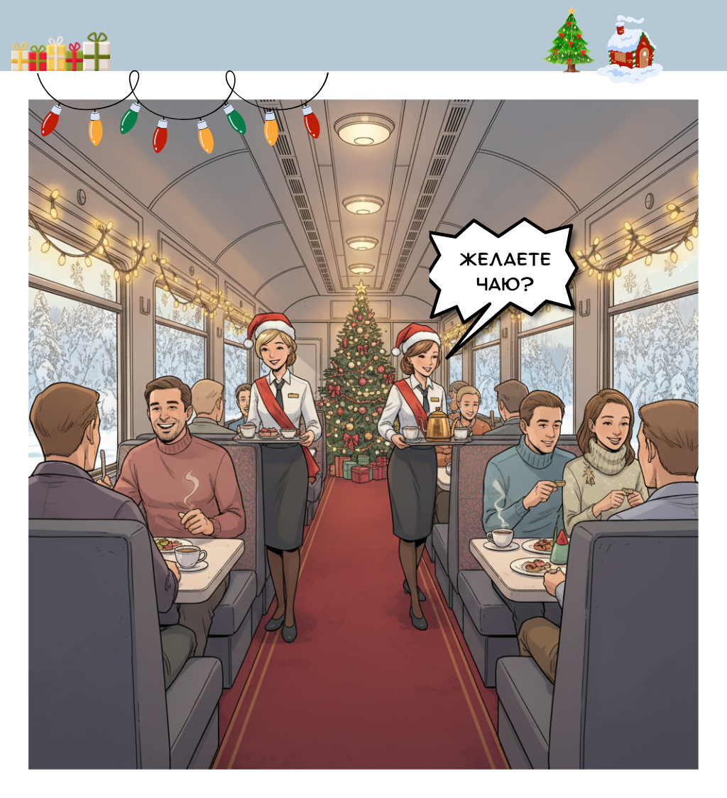 Здесь всё в лучших традициях сказочных путешествий: мягкая ковровая дорожка в вагоне, уютные купе, душевные проводники и шикарный вагон-ресторан, в котором по вечерам звучат рождественские мелодии и играют в настолки…